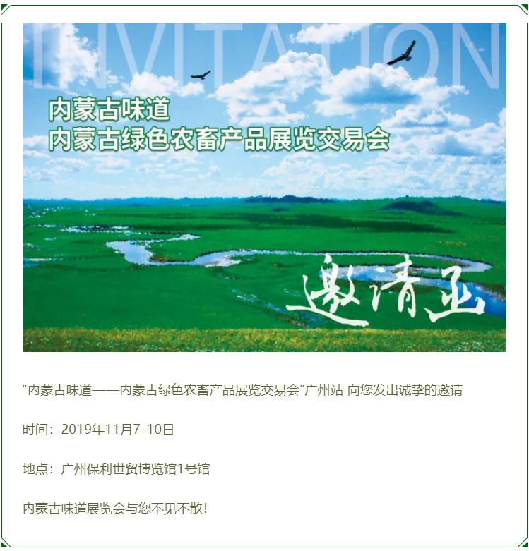 2019内蒙古味道—内蒙古绿色农畜产品展览交易会将于11月7-10日在广州保利世贸博览馆1层1号展馆举办,展出面积11300平方米。
