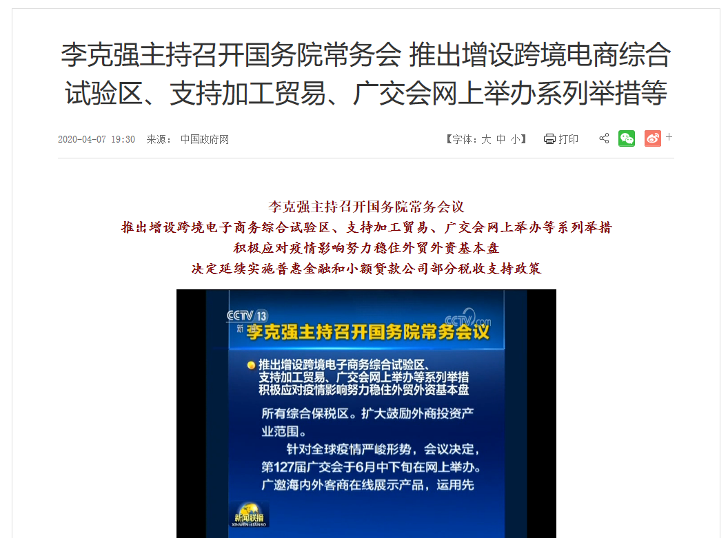4月7日召开的国常会,推出增设跨境电子商务综合试验区、支持加工贸易、广交会网上举办等系列举措,积极应对疫情影响努力稳住外贸外资基本盘。